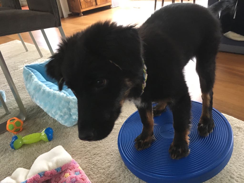 Dieses Tricktraining macht uns ganz viel Freude. Mit den Vorderpfoten auf mittlerweile schon ganz kleinen Gegenständen stehen, auf dem Wackelbrett balancieren mussten wir wieder neu üben), in einen kleinen Behälter mit allen vier Pfoten hinein steigen, Pfote geben, mit der Schnauze an verschiedenste Gegenstände andocken, sich von der mit Leckerli gefüllten Hand abwenden…… sind so einige Dinge, die er mit Begeisterung macht.