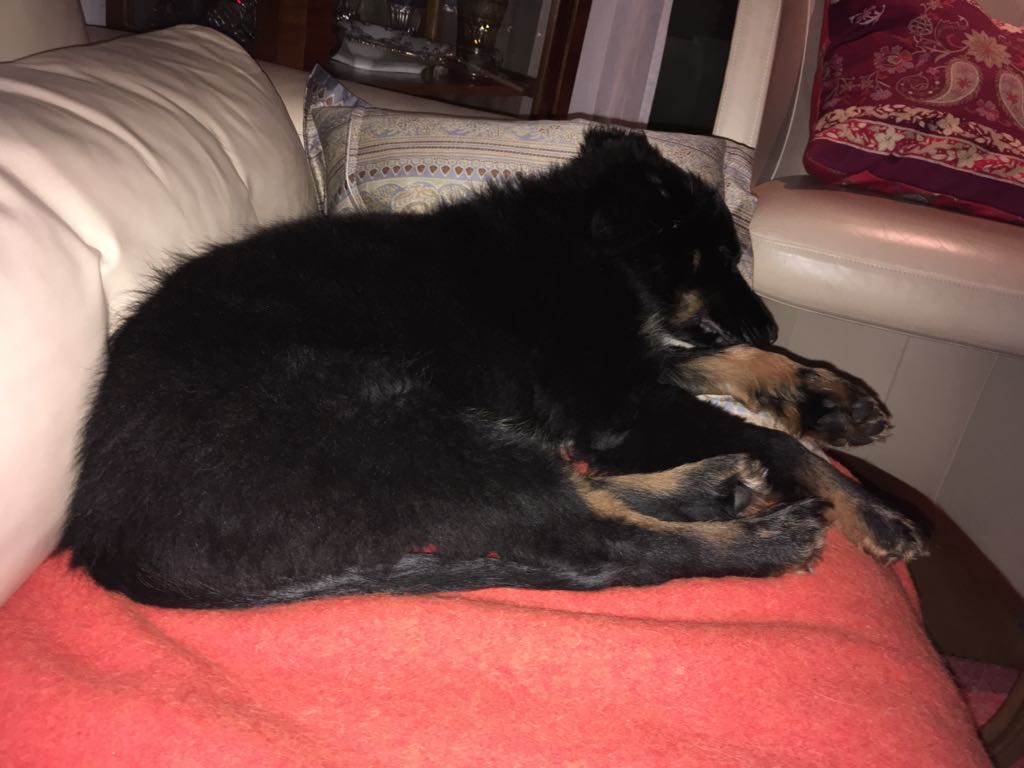 Black tri Rüde ebenfalls ohne Abzeichen am Kopf und Hals. Auch auf den Pfoten fast nichts nur weiße Zehen. Unser kleiner black Panter.